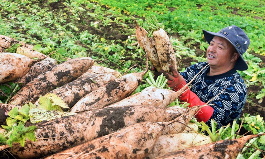 2018年12月22日,在海拔3600米的理塘縣濯桑鄉(xiāng)康藏陽光蔬菜生產(chǎn)加工基地,村民們正在采收水果蘿卜。這批水果蘿卜將遠(yuǎn)銷港澳市場(chǎng)。水果蘿卜在香港的零售價(jià)是每公斤20港元,約合人民幣17元多。