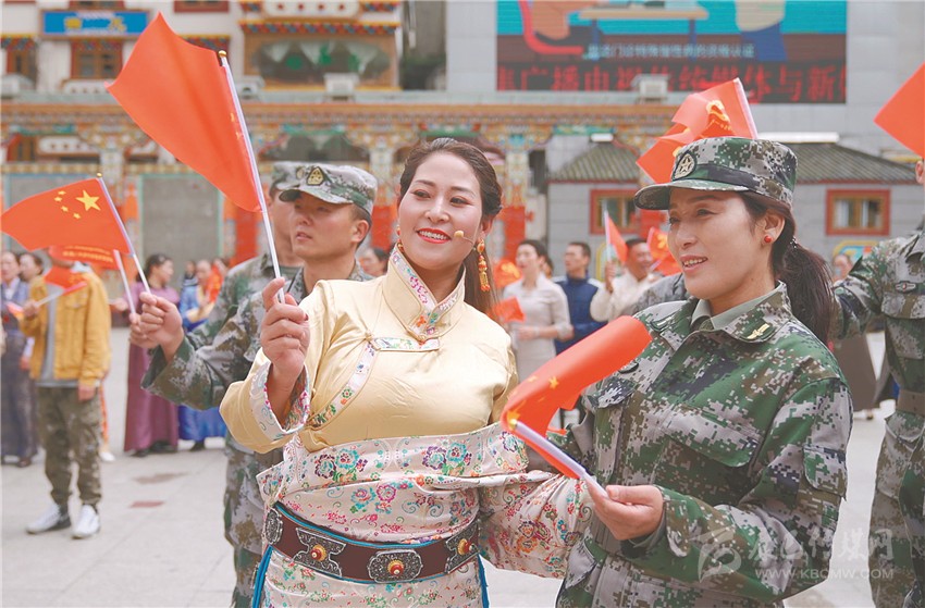 當日下午2時許,“康定溜溜調(diào)”省級非物質(zhì)文化遺產(chǎn)傳承人毛云剛緩步走到廣場中間的建州七十年主題景觀“鍋莊篝火”旁邊,一段原生態(tài)山歌隨即從他口中傳出?!芭荞R山上青松林,心上的人兒.....”仿佛從歷史深處走來的情歌,立刻吸引到游人和散步市民駐足聆聽。隨后,其美多吉和歌手們走向主題景觀,唱響名揚全球的《康定情歌》,身著制服的各行業(yè)工作人員,循著歌聲不約而同走向廣場中央,青年志愿者們?yōu)榫蹟n上前的人們發(fā)放小國旗和印有“建州70年Logo”的小紅旗......