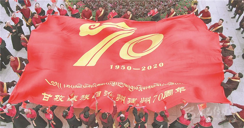 美妙的歌聲縈繞四方,鮮艷的旗幟迎風飄揚。就在眾人忘情高歌之時,來自州歌舞團的50多名演員將一面巨大的印有“建州70年Logo”的紅旗,在廣場正中鋪展開來。以這面旗幟為中心,先后到來的人們組成了三個同心圓,用歌聲禮贊甘孜州建州70周年。