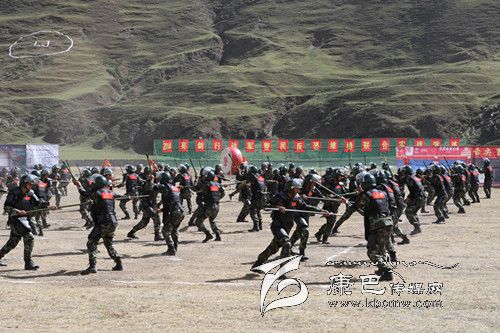 在實戰(zhàn)技能演練中,各單位都表演了自己的拿手絕技:由武警甘孜州支隊雪山飛虎隊20名官兵演練的特種射擊;武警四川總隊第二支隊演練的格斗術;中國人民解放軍甘孜軍分區(qū)獨立營120名官兵演練刺殺操;武警甘孜支隊一大隊和三大隊200名官兵演練的防暴對抗;雪山飛虎隊隊員帶來的硬功表演;州公安局特警支隊特警演練的“雪狼十七式”、摔擒配套動作、實戰(zhàn)對抗。據(jù)了解,“雪狼十七式”是甘孜公安特警通過六年來在高原維穩(wěn)駐訓、處置突發(fā)事件,摸索出來的摔擒動作,具有極強的殺傷力,能瞬間制敵。它是我州特警隊員實戰(zhàn)中克敵制勝的法寶,是特警隊員必備的基本功。