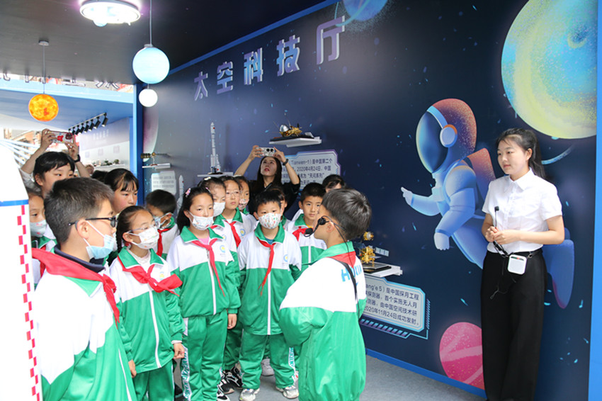 “航天夢(mèng)是中國夢(mèng)、華夏夢(mèng),神舟十六號(hào)載人飛船發(fā)射成功并進(jìn)入預(yù)定軌道。古人仰望星空,幻想上天攬?jiān)碌膲?mèng)想,在一代代中國航天人的努力下逐漸變?yōu)榱爽F(xiàn)實(shí)?!薄凹t領(lǐng)巾”講解員劉嘉沐在解說他負(fù)責(zé)的天空科技廳時(shí),將這一喜訊分享給了在場(chǎng)的同學(xué)們?!跋M芙枭裰凼?hào)載人飛船發(fā)射成功的機(jī)會(huì),在科普周活動(dòng)中普及航天知識(shí),讓更多的學(xué)生深入了解航天文化,引導(dǎo)青少年傳承航天精神、點(diǎn)燃航天夢(mèng)想?!敝菘茀f(xié)負(fù)責(zé)人告訴記者。