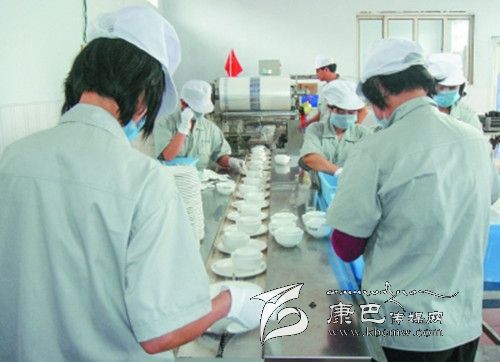 6、包裝。經(jīng)過消毒后的餐具被送到約2米長的綠色傳送帶上,工人先用手把餐具按照包裝要求擺放好。之后送到包裝機(jī)器,用包裝膜封口包裝。