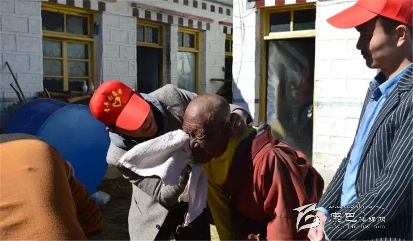 2015年11月10日理塘縣圣地青年志愿者服務(wù)隊(duì)成員勒布降措與向濤為曲登鄉(xiāng)敬老院孤寡老人理發(fā)。