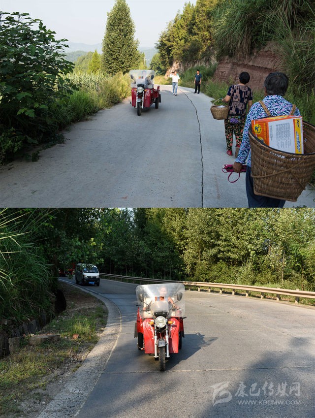 8月15日清晨,周強(qiáng)善在前往集市趕場(chǎng)的路上。攝影 張可凡