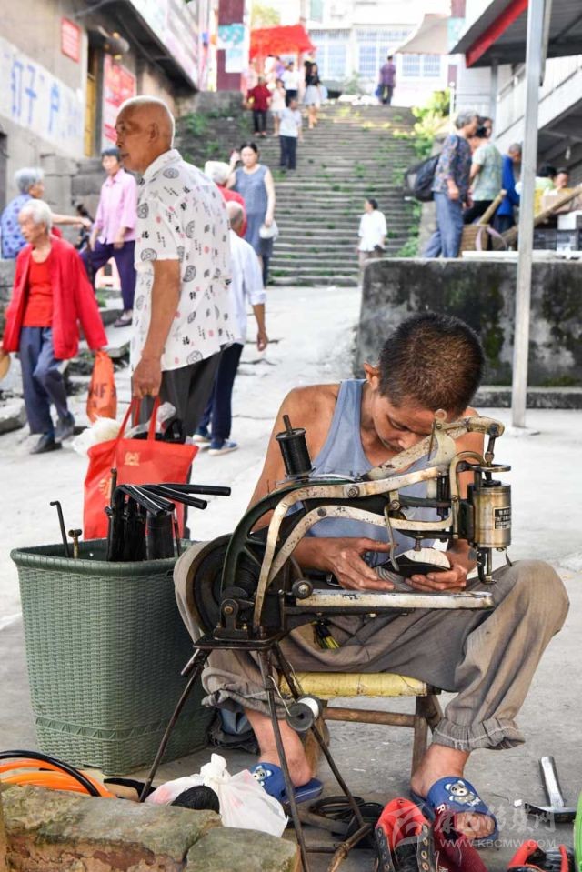 周強(qiáng)善把機(jī)動(dòng)三輪車(chē)停到文化街上一家無(wú)名超市的門(mén)前,將縫紉機(jī)等工具一件件搬下來(lái),就著臺(tái)階擺起了攤子。