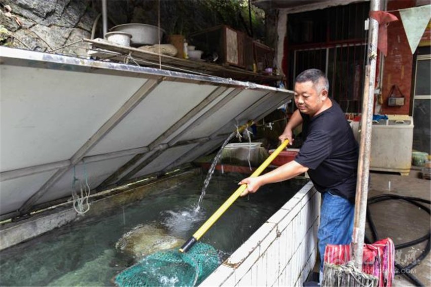 在各方幫扶下,2015年,朱國(guó)富借了10多萬(wàn)元,在家門口開起了“黑灣魚莊”。農(nóng)家樂開起來(lái)了,日子又開始紅火起來(lái)。