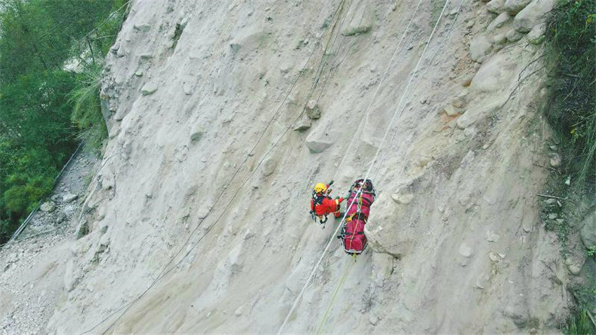 9月7日18時(shí)許,救援人員從海螺溝景區(qū)將一位受傷群眾用擔(dān)架運(yùn)出。因景區(qū)通往磨西鎮(zhèn)的主干道還在搶通中,救援人員采取吊繩、拖拉的方式,將受傷群眾從斷道處向上運(yùn)送到落差一百多米的安全處,再由等候的救護(hù)車(chē)運(yùn)送至醫(yī)療點(diǎn)。四川日?qǐng)?bào)全媒體記者 吳聃 攝