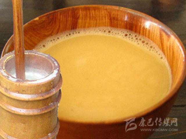 酥油茶是藏族群眾每日必備的飲品。是西藏高原生活的必需。寒冷的時候可以驅(qū)寒;吃肉的時候可以去膩;饑餓的時候可以充饑;困乏的時候可以解乏;瞌睡的時候,還可以清醒頭腦。藏民們?nèi)粘V谱魉钟筒钑r一般使用磚茶,需要時用刀切削一小塊備用。然后在鍋中加300毫升水煮沸,加3到5克碎磚茶,煮到茶水變黑熄火。茶水變色后,可加入0.5克鹽。如果天氣寒冷的話還可以多加一些鹽。最后,再加入2克酥油(約湯匙的三分之二)。飲用時將酥油茶經(jīng)過濾網(wǎng)注入茶壺中再倒進(jìn)小茶杯飲用。