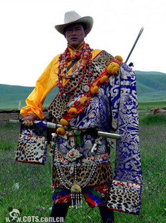 吐蕃時期   藏族服飾文化有了較大的發(fā)展。"中二丁王"時(相當(dāng)于中原西漢中期),南方雅隆河谷的吐蕃開始了冶煉鐵、銅、銀等礦產(chǎn),為金屬飾品的出現(xiàn)創(chuàng)造了條件。藏史記載,公元三世紀(jì)的拉妥妥日年贊時,吐蕃贊普的服飾巳與眾不同,出現(xiàn)了服飾等級的差異。史載松贊干布時期,吐蕃的歷史翻開了新的一頁,吐蕃文化得到迅速的發(fā)展,其服飾文化日漸發(fā)達(dá)。吐蕃奴隸制王朝等級森嚴(yán),在服飾上的表現(xiàn)也日臻完備。從反映吐蕃盛時的敦煌壁畫可看出,君臣服飾的等級差異,藏王一般只有贊普才能使用的三瓣寶冠箍住的有凹槽裝飾的無沿帽,呈紅色,通常高于一般人的帽子;藏王的侍從或臣下往往戴平頂無沿帽。衣袍的式樣也各有不同,官吏的章飾規(guī)定有一等瑟瑟,二等金,三等金包銀,四等銀,五等銅,六等鐵等大小兩類,共十二級,裝在方圓三寸的盒子里掛在胸前,以區(qū)別職位的高低。武將的頭盔有形如塔的裝飾,戰(zhàn)士頭盔上有三只彩旗以表示出生的年月,隨著"惟以淬礪為業(yè)"的吐蕃冶煉業(yè)的發(fā)展,軍隊的鎧胄日趨精良,有的周身僅露兩個眼窩,勁弓利刃常不能破,其威嚴(yán)、勇猛之氣在今天大昭寺壁畫的吐蕃武士像中尚歷歷在目。吐蕃貴族不僅本人穿著華貴,還在聚會宴客時,把傭人裝飾起來。而作為贊普的松贊干布則用一種紅帶子包頭,身著長袍,足穿腳尖朝上的靴子,據(jù)《紅史》載,這種王服是受波斯王朝的影響,反映了文化交往已影響到了服飾文化層次,而從松贊干布伊始的吐蕃與中原的密切交往,兩種民族文化的長期接觸更為藏族服飾的發(fā)展注入了新鮮血液。史載文成公主進(jìn)藏時,帶入諸種花緞、錦、綾羅與諸色衣料二萬匹,還有大量的金玉器具。松贊干布及吐蕃大臣紛紛自行去掉氈裘,改穿絹綺。近代西藏的高級官吏,頭發(fā)綰成一髻,戴金翅白紗帽,這是唐代進(jìn)士的服飾。此外,還采納文成公主建議,令國人禁止"赭面"(用油涂面),文成公主進(jìn)藏還帶來了種植蠶桑和紡織技術(shù),"植桑織絲兮"大大的促進(jìn)了吐蕃服飾技藝的發(fā)展,青海海西州都蘭出土的大批吐蕃服飾文物,真實、生動地反映了吐蕃服飾的工藝水平。服裝的織物紋樣多為聯(lián)珠動物紋,裝飾品的金質(zhì)首飾、佩飾的精美使人嘆為觀止。今天藏族婦女飾品的鑲嵌形制,可以從這些文物中找到原型。斯坦因的《古代中亞文化遺跡》一書也曾提到:"在吐蕃發(fā)現(xiàn)的遺物中,有很多具有花紋的絲織物,花紋中有些是印的,有些是織的,花紋圖象的變化很多,這一點很可以表示吐蕃商業(yè)的地位,……大概是中國與西亞之間的貿(mào)易重點。"頻繁的交往促進(jìn)了吐蕃經(jīng)濟的發(fā)展,也促進(jìn)了服飾文化的發(fā)展。 吐蕃是一個軍事帝國,在它的發(fā)展過程中征服融合了青藏高原及其邊緣地區(qū)的許多其他民族,這是造成今天各地區(qū)藏族之間文化差異的重要原因。在服飾的表現(xiàn)上也是如此。吐蕃時代這種差異主要表現(xiàn)為東女、附國、黨項等部落服飾的不同,東女部落住在康延川(今昌都),處于母系氏族社會發(fā)展階段,其女王穿青毛綾(氆氌)裙,上披青袍,袖長到地,冬穿用文錦裝飾的羔裘。發(fā)作鬟髻狀,兩耳垂珰(耳環(huán))。足穿革素(皮靴)。一般男子披發(fā),婦女辨發(fā),男女都用彩色涂面。王死居喪三年,不易服,不梳洗。附國是以今四川甘孜為中心,包括今四川阿壩一帶的嘉絨藏人的藏羌融合體。他們頭戴圓形皮帽,或帶幕離佳(即面罩一類飾物,為婦女所帶)。身披毛曷毛(氆氌一類)、皮裘,穿牛皮鞋。頸系鐵索,手貫鐵釧。王與酋長以金為首飾,胸前掛著三寸長的金花。黨項則是純游牧部落,"服氈襲褐,披氈以為上飾",早在北周時巳能制造精美的犀甲、鐵鎧。四川西北部還有屬黨項部落聯(lián)盟的鄧至、武興國和宕昌等,服飾習(xí)俗為頭藏烏皂突騎帽,身穿長袍,下著小口褲、足穿皮靴,與今四川牧區(qū)藏族服飾相似。此外青海地區(qū)有吐谷渾,貴婦人披錦袍,戴金花冠。如女發(fā)型為辨發(fā)披于后,后飾珠貝,以繁多為高貴,這一服飾與今青海藏族婦女大致相同。這些地區(qū)服飾特征是今天各地不同藏族服飾的母型。 吐蕃王朝崩潰后,從九世紀(jì)中期到第十一世紀(jì)的二百余年間,西藏社會一直處于分裂割據(jù)的混亂狀況。這一時期戰(zhàn)亂不堪,服飾藝術(shù)的發(fā)展也難免厄運,停滯不前,而與戰(zhàn)爭有關(guān)的武士服飾卻濟時發(fā)展。在西藏阿里古格王國的遺址中,發(fā)掘有大量古代武士的盔甲和武器。其鎧甲多為鋼片甲,是用細(xì)皮條串結(jié)鋼片而成,串結(jié)方法頗為復(fù)雜,武器中的盾牌,系用藤條編織為圓形,直徑八十厘米,正面鑲有銅質(zhì)加固件,銅件上雕刻有細(xì)密的紋飾,故亦可謂是銅飾件,背面有四個銅環(huán),環(huán)間可用皮條相連,作握柄之用,無論這些服飾和兵器,是西藏本地生產(chǎn),還是外來流入,都說明其時西藏的武士服飾已具鮮明的本土特征與個性。 佛教僧侶服飾興起  這一時期的服飾發(fā)展還有一個特點就是佛教僧侶服飾的興起。公元八世紀(jì),西藏出現(xiàn)了第一批僧人,服飾由贊普府庫供給,后由百姓、政府共同供養(yǎng)。佛教服飾亦形成等級區(qū)別,并有節(jié)日與平時的不同裝束,自成體